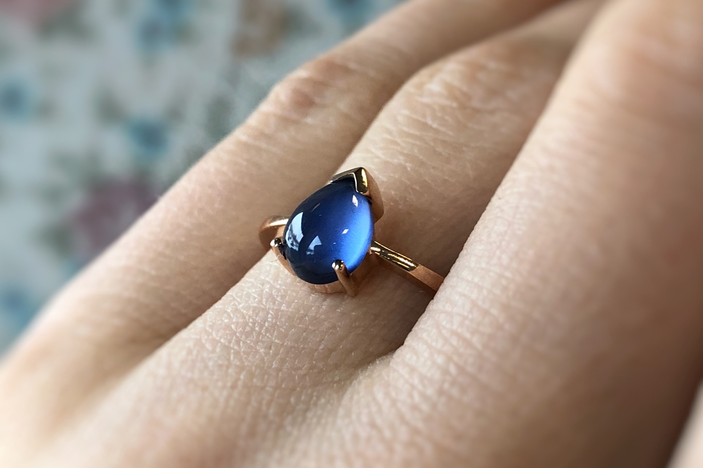 Damenring, Krappenfassung. Ein Symbol der Träne als Symbol der Erinnerung. Ein Cabochon in Tropfenform transportiert die Geschichten der ewigen Liebe.